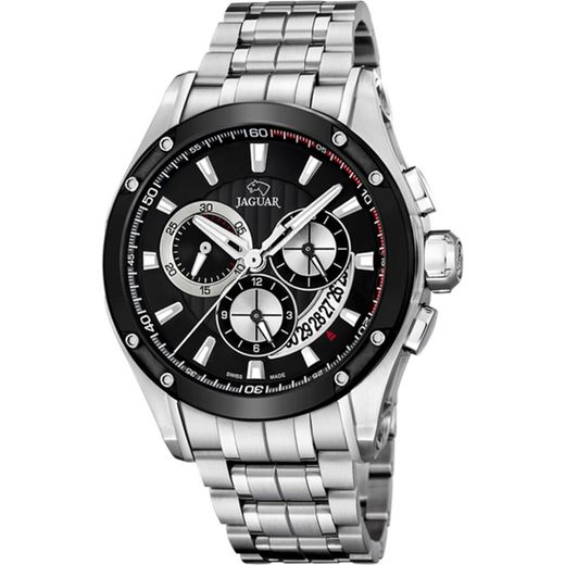 Jaguar Herrenuhr J1034/1, Swiss Made, Stahl. 45-mm-Stahlgehäuse. Schwarze Stahllünette. Stahlarmband in robuster Ausführung. Faltschließe. Schwarzes Zifferblatt. Multifunktions-, Kalender- und Doppeldruckknopf-Stoppuhr. Saphirglas. Quarzwerk. In der Schweiz hergestellt. Tauchfähig 100 m. 3 Jahre Garantie. Art.-Nr. J1034/1