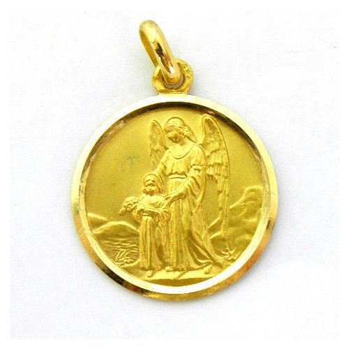 Medalla Oro 18kts Angel De La Guarda Bisel Lapidado 14mm M1/11/14/14