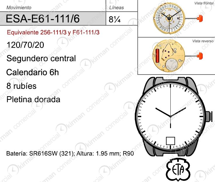Movimiento Reloj Cuarzo ETA ESA-E61-111/6 Calendario 6H. Movimiento de cuarzo Bateria 321 con 8 rubíes Pletina Dorada. Diseño de E61-111/6 con segundero central, calendario a las 6H. Producto de excelente calidad, con garantía contrastada que asegura su fiabilidad y durabilidad. Ref ESA-E61-111/6