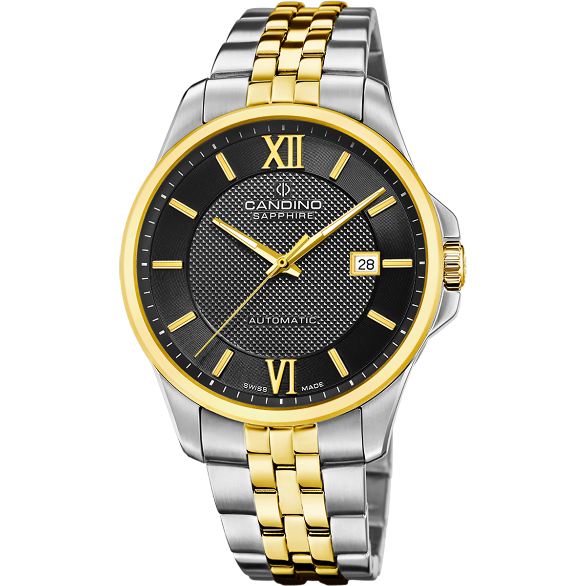 Reloj Candino Hombre C4769/4 Acero Bicolor Dorado Automático Analógico. Caja de acero inoxidable plateado bicolor dorado de 42mm de diámetro. Bisel dorado. Brazalete de acero inoxidable plateado bicolor dorado. Cierre desplegable. Esfera negra. Multifunción, calendario. Cristal zafiro. Movimiento automático. Swiss Made. Sumergible 50m. Peso 180gr. 3 años de garantía. Ref C4769/4