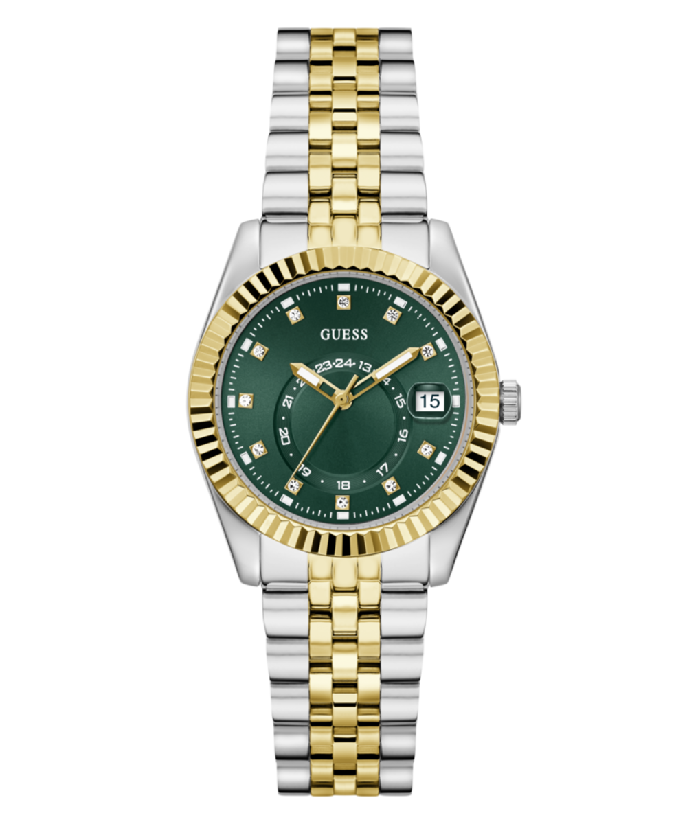 Reloj Guess Mujer GW0936L3 Jada Acero Plateado Bicolor Dorado Analógico. Caja de acero plateado bicolor dorado de 34mm de diámetro. Bisel dorado. Brazalete de acero plateado bicolor dorado. Cierre desplegable. Esfera verde. Multifunción, calendario. Cristal mineral. Movimiento quartz. Sumergible 50m. 3 años de garantía. Ref GW0936L3