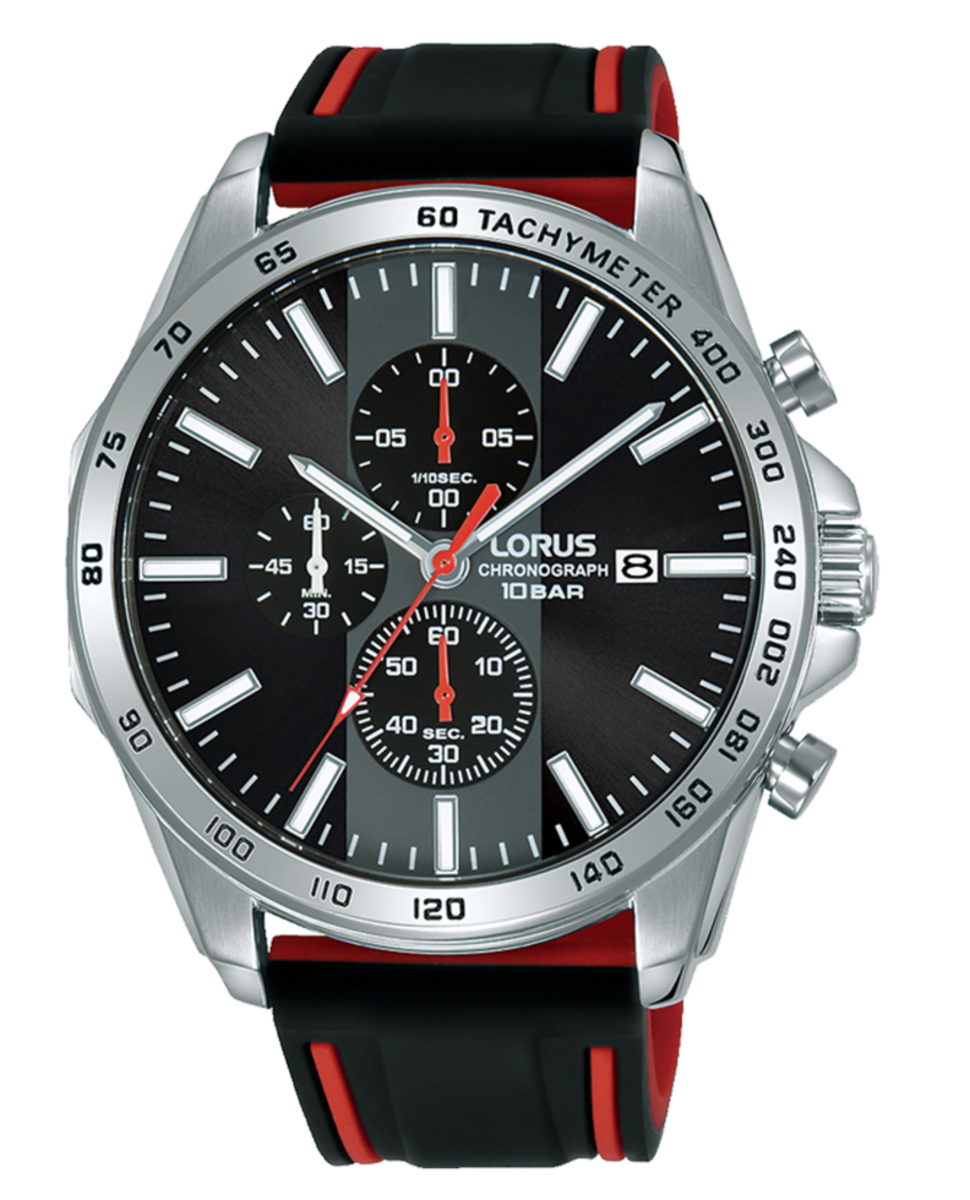 Reloj Lorus Hombre RM345GX9 Sport Negro Bicolor Rojo. Caja de acero de 44mm. Correa de silicon negra bicolor roja. Cierre hebilla. Esfera negra. Multifunción, calendario, cronometro. Cristal mineral. Movimiento quartz. Sumergible 100m. 3 ańos de garantía. Ref RM345GX9