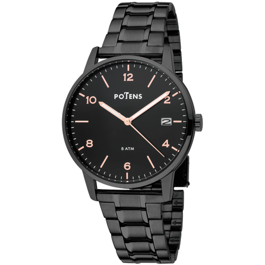 Reloj Potens Hombre 40-2990-0-A1 Acero Negro Analógico. Caja de acero inoxidable negra de 42 mm de diámetro. Bisel negro. Brazalete de acero inoxidable negro. Cierre desplegable de acero inoxidable. Esfera negra bicolor rose. Calendario, hora, minutos, segundos. Cristal mineral. Movimiento quartz. Sumergible 50m. 3 ańos de garantía. Ref 40-2990-0-A1