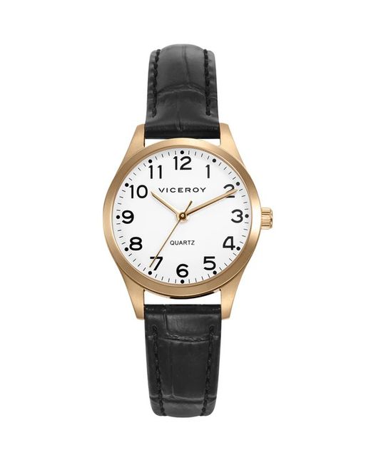 Viceroy Damenuhr 42222-94 Schwarzes Leder. 29 mm goldenes IP-Stahlgehäuse. Schwarzes Lederarmband. Schnallenverschluss. Weißes Zifferblatt. Mineralkristall. Quarzwerk. Tauchboot 50m. 3 Jahre Garantie. Ref. 42222-94